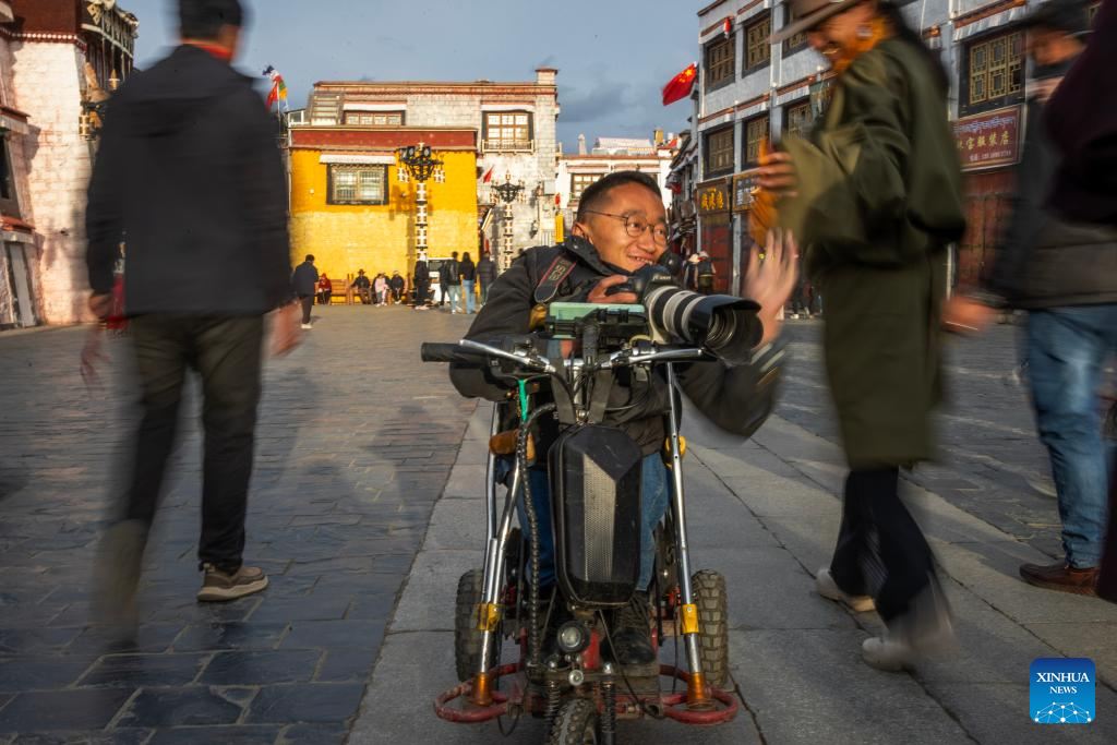 LHASA, 6 mayo, 2025 (Xinhua) -- Imagen del 29 de abril de 2025 de Lhapa Dondrup saludando a un amigo mientras toma fotografías en la calle Barkhor, en Lhasa, en la región autónoma de Xizang, en el suroeste de China. Lhapa Dondrup, un hombre de 24 años nacido en Lhasa, padece osteogénesis imperfecta, comúnmente conocida como enfermedad de los huesos de cristal, desde la infancia. Ahora, como adulto, mide menos de un metro de altura y depende de muletas y una silla de ruedas eléctrica para desplazarse. A pesar de estos desafíos, Lhapa alberga el sueño de convertirse en fotógrafo. (Xinhua/Jiang Fan)