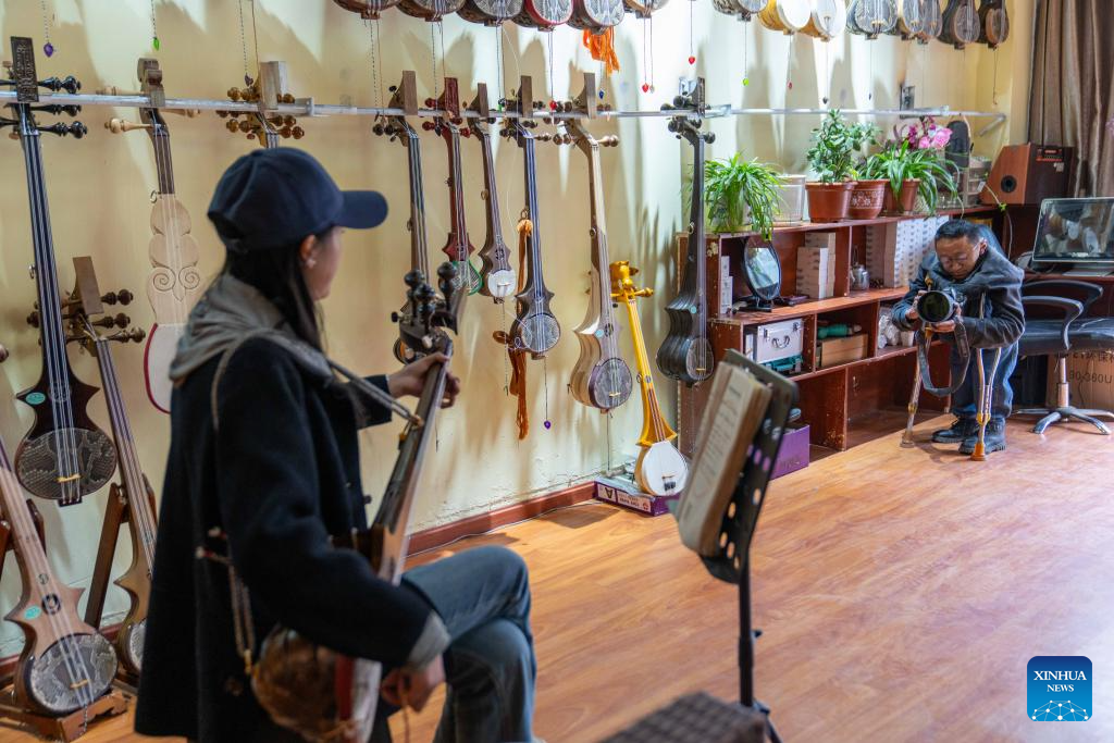 LHASA, 6 mayo, 2025 (Xinhua) -- Lhapa Dondrup graba a una compañera tocando el Zhanian, un instrumento de cuerda tradicional tibetano en una empresa, en Lhasa, en la región autónoma de Xizang, en el suroeste de China, el 6 de mayo de 2025. Lhapa Dondrup, un hombre de 24 años nacido en Lhasa, padece osteogénesis imperfecta, comúnmente conocida como enfermedad de los huesos de cristal, desde la infancia. Ahora, como adulto, mide menos de un metro de altura y depende de muletas y una silla de ruedas eléctrica para desplazarse. A pesar de estos desafíos, Lhapa alberga el sueño de convertirse en fotógrafo. (Xinhua/Tenzing Nima Qadhup)