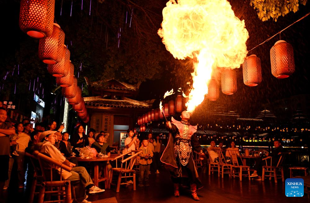 BEIJING, 6 mayo, 2025 (Xinhua) -- Imagen del 4 de mayo de 2025 de turistas observando un espectáculo de escupir fuego a lo largo del río Gongshui, en el distrito de Xuan'en, en la provincia de Hubei, en el centro de China. Durante las vacaciones de cinco días por el Primero de Mayo, los viajeros chinos realizaron unos 314 millones de viajes internos, lo que representa un incremento del 6,4 por ciento respecto al año previo, según cifras publicadas por el Ministerio de Cultura y Turismo. (Xinhua/Song Wen)