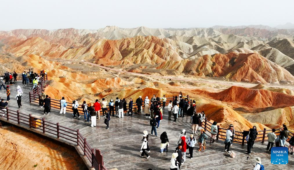BEIJING, 6 mayo, 2025 (Xinhua) -- Imagen del 4 de mayo de 2025 de turistas visitando el Parque Nacional Geológico Danxia, en Zhangye, en la provincia de Gansu, en el noroeste de China. Durante las vacaciones de cinco días por el Primero de Mayo, los viajeros chinos realizaron unos 314 millones de viajes internos, lo que representa un incremento del 6,4 por ciento respecto al año previo, según cifras publicadas por el Ministerio de Cultura y Turismo. (Xinhua/Cheng Lin)