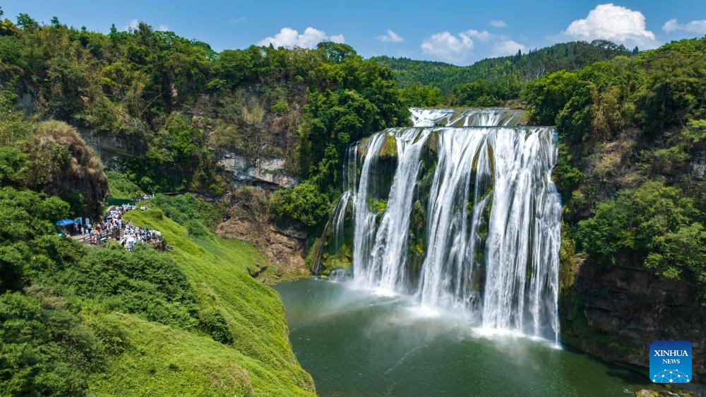 BEIJING, 6 mayo, 2025 (Xinhua) -- Vista aérea tomada con un dron el 4 de mayo de 2025 del área escénica de Huangguoshu, en la ciudad de Anshun, en la provincia de Guizhou, en el suroeste de China. Durante las vacaciones de cinco días por el Primero de Mayo, los viajeros chinos realizaron unos 314 millones de viajes internos, lo que representa un incremento del 6,4 por ciento respecto al año previo, según cifras publicadas por el Ministerio de Cultura y Turismo. (Xinhua/Chen Xi)