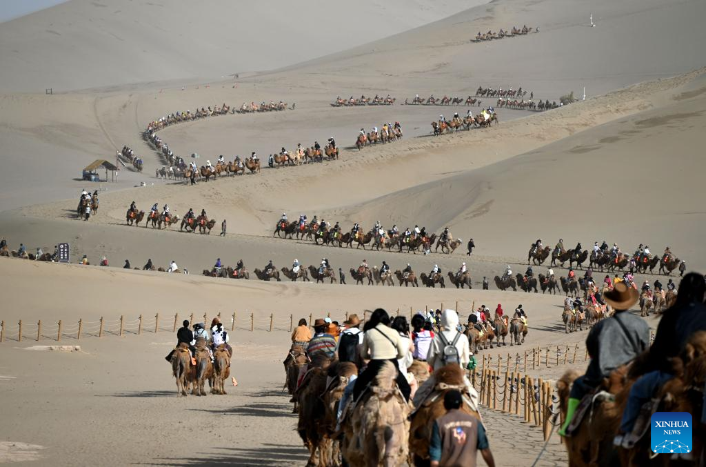 BEIJING, 6 mayo, 2025 (Xinhua) -- Imagen del 4 de mayo de 2025 de turistas visitando el punto escénico de la Montaña Mingsha y el Manantial de la Luna Creciente, en Dunhuang, en la provincia de Gansu, en el noroeste de China. Durante las vacaciones de cinco días por el Primero de Mayo, los viajeros chinos realizaron unos 314 millones de viajes internos, lo que representa un incremento del 6,4 por ciento respecto al año previo, según cifras publicadas por el Ministerio de Cultura y Turismo. (Xinhua/Zhang Xiaoliang)