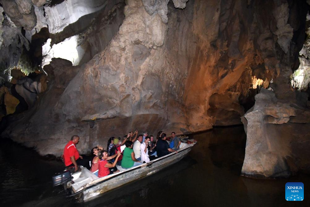 PINAR DEL RIO, 6 mayo, 2025 (Xinhua) -- Imagen del 5 de mayo de 2025 de excursionistas navegando por la "Cueva del indio", una larga caverna calcárea por donde corre el río San Vicente, en la localidad de Viñales, en la provincia de Pinar del Río, Cuba. La exuberante naturaleza del extremo occidental de Cuba y de manera particular de la localidad de Viñales, constituye un atractivo que el Ministerio de Turismo de la isla trata de desarrollar con la vista puesta en el mercado chino. (Xinhua/Joaquín Hernández)
