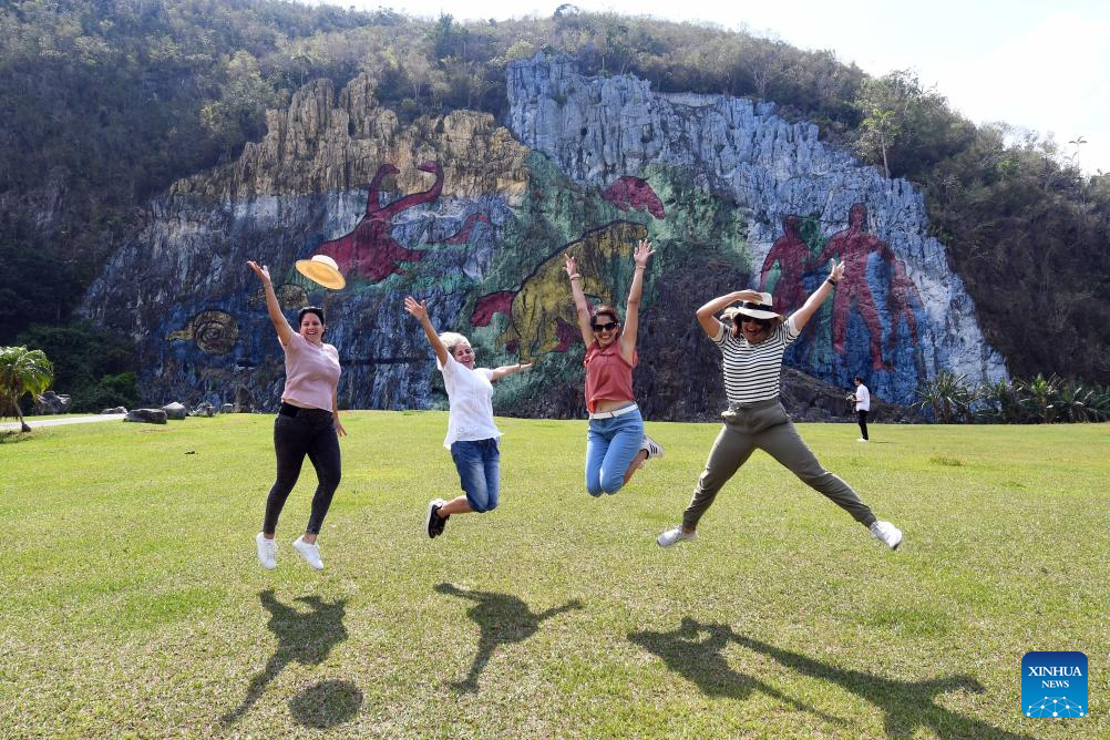 Imagen del 5 de mayo de 2025 de jóvenes turistas saltando frente al Mural de la Prehistoria, una obra de 80 metros de altura por 120 de ancho hecha sobre las rocas para representar el pasado geológico y biológico de la región, en el valle de Viñales, en la provincia de Pinar del Río, Cuba. La exuberante naturaleza del extremo occidental de Cuba y de manera particular de la localidad de Viñales, constituye un atractivo que el Ministerio de Turismo de la isla trata de desarrollar con la vista puesta en el mercado chino. (Xinhua/Joaquín Hernández)