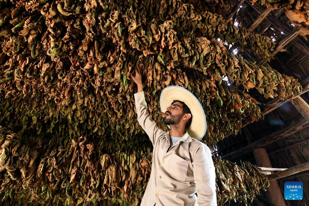 PINAR DEL RIO, 6 mayo, 2025 (Xinhua) -- Imagen del 5 de mayo de 2025 de un campesino revisando hojas de tabaco tendidas en un secadero, en la localidad de Viñales, en la provincia de Pinar del Río, Cuba. La exuberante naturaleza del extremo occidental de Cuba y de manera particular de la localidad de Viñales, constituye un atractivo que el Ministerio de Turismo de la isla trata de desarrollar con la vista puesta en el mercado chino. (Xinhua/Joaquín Hernández)