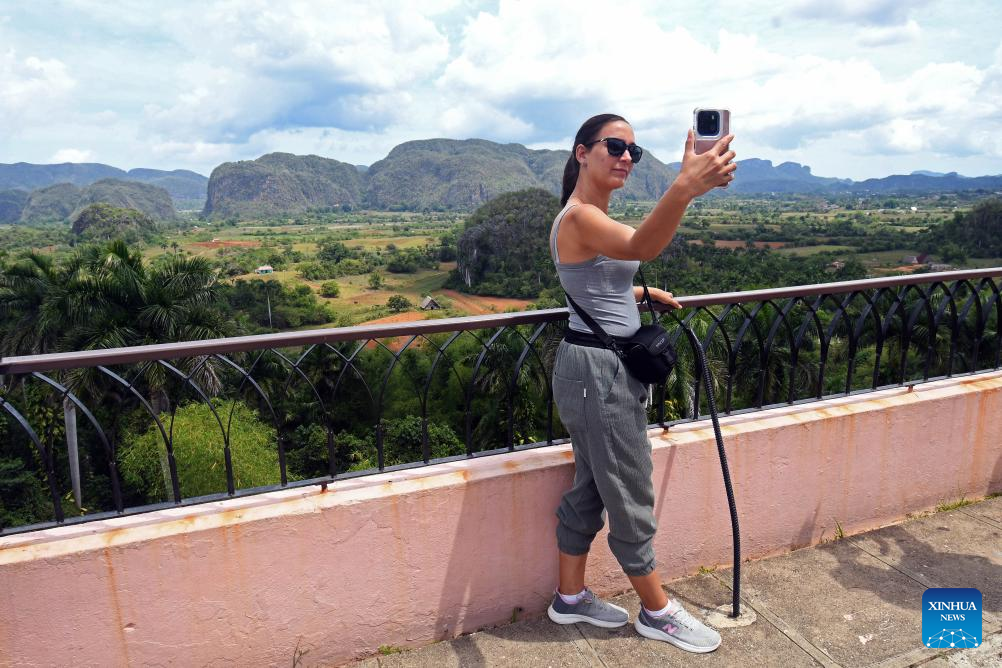 PINAR DEL RIO, 6 mayo, 2025 (Xinhua) -- Imagen del 5 de mayo de 2025 de una turista tomándose una fotografía frente a los mogotes del valle de Viñales, en la provincia de Pinar del Río, Cuba. La exuberante naturaleza del extremo occidental de Cuba y de manera particular de la localidad de Viñales, constituye un atractivo que el Ministerio de Turismo de la isla trata de desarrollar con la vista puesta en el mercado chino. (Xinhua/Joaquín Hernández)