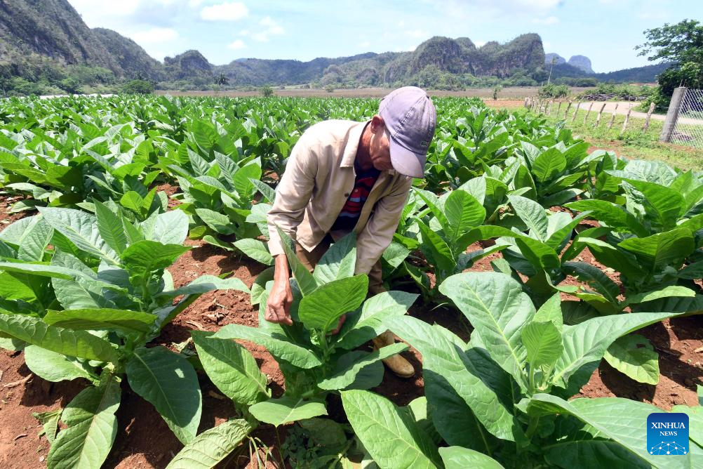 PINAR DEL RIO, 6 mayo, 2025 (Xinhua) -- Imagen del 5 de mayo de 2025 de un campesino trabajando en un campo de tabaco, en el valle de Viñales, en la provincia de Pinar del Río, Cuba. La exuberante naturaleza del extremo occidental de Cuba y de manera particular de la localidad de Viñales, constituye un atractivo que el Ministerio de Turismo de la isla trata de desarrollar con la vista puesta en el mercado chino. (Xinhua/Joaquín Hernández)