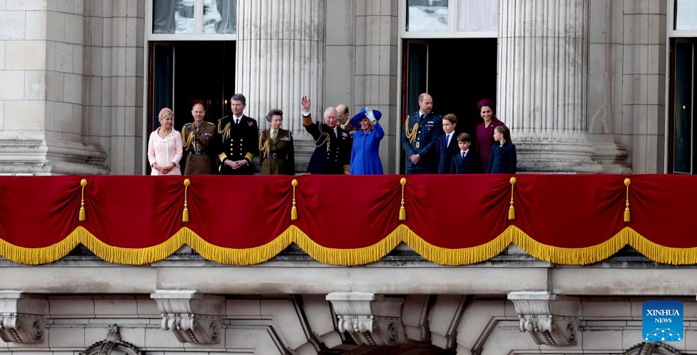 LONDRES, 6 mayo, 2025 (Xinhua) -- Imagen del 5 de mayo de 2025 del rey Carlos III y la reina Camila de Reino Unido saludando en el balcón del Palacio de Buckingham, en Londres, Reino Unido. Reino Unido realizó procesiones militares y un sobrevuelo de la Real Fuerza Aérea el lunes para conmemorar el 80 aniversario del Día de la Victoria en Europa. (Xinhua/Li Ying)