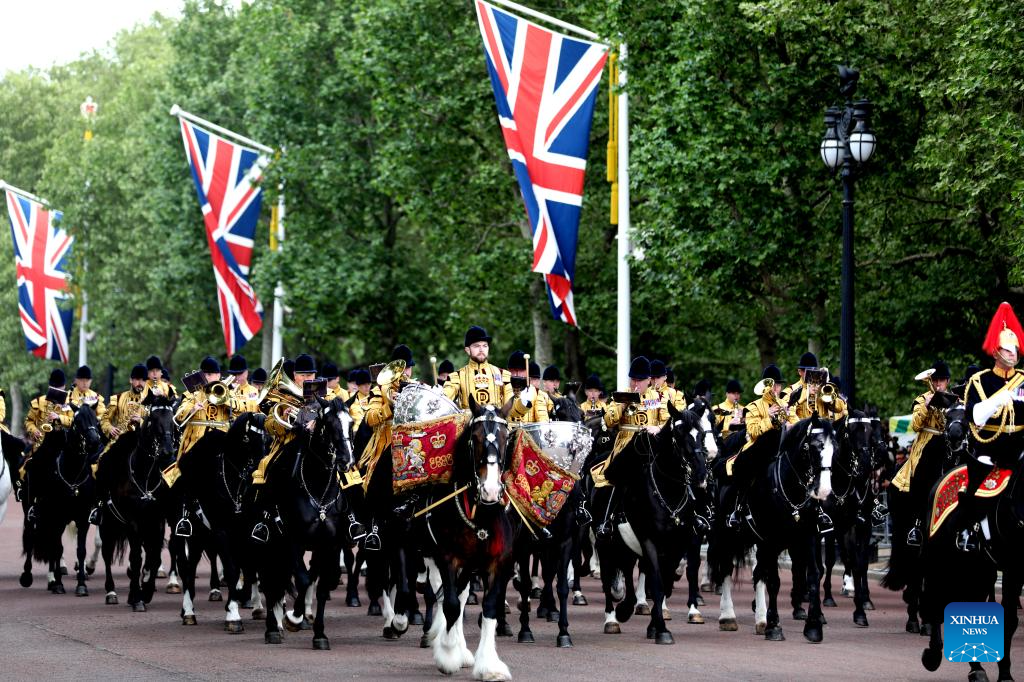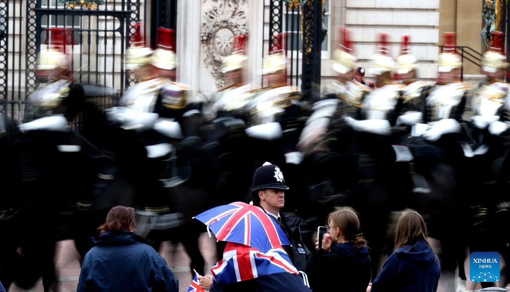 LONDRES, 6 mayo, 2025 (Xinhua) -- Imagen del 5 de mayo de 2025 de miembros de las fuerzas armadas para la procesión militar caminando por el Palacio de Buckingham, en Londres, Reino Unido. Reino Unido realizó procesiones militares y un sobrevuelo de la Real Fuerza Aérea el lunes para conmemorar el 80 aniversario del Día de la Victoria en Europa. (Xinhua/Li Ying)