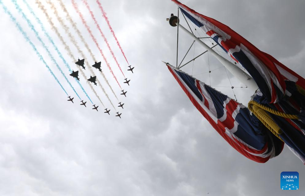 LONDRES, 6 mayo, 2025 (Xinhua) -- Imagen del 5 de mayo de 2025 de aviones volando en formación, en Londres, Reino Unido. Reino Unido realizó procesiones militares y un sobrevuelo de la Real Fuerza Aérea el lunes para conmemorar el 80 aniversario del Día de la Victoria en Europa. (Xinhua/Li Ying)