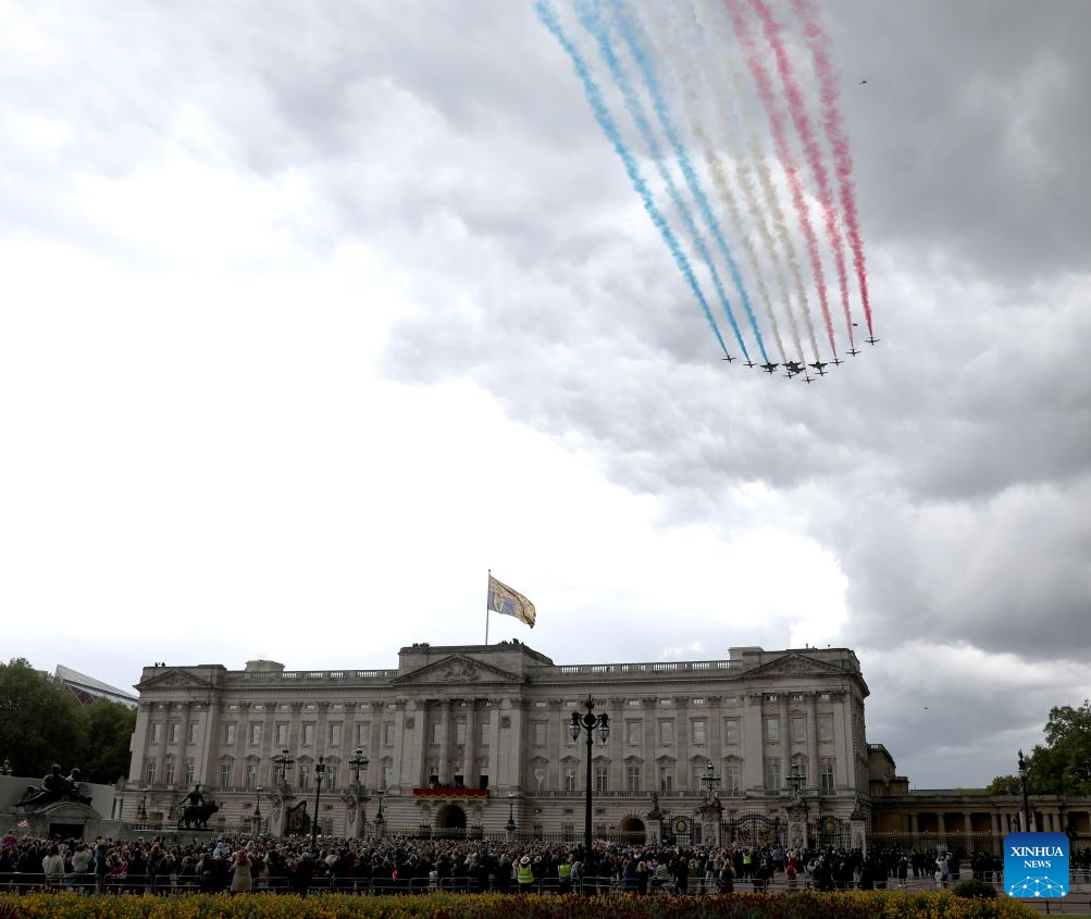 LONDRES, 6 mayo, 2025 (Xinhua) -- Imagen del 5 de mayo de 2025 de aviones volando en formación sobre el Palacio de Buckingham, en Londres, Reino Unido. Reino Unido realizó procesiones militares y un sobrevuelo de la Real Fuerza Aérea el lunes para conmemorar el 80 aniversario del Día de la Victoria en Europa. (Xinhua/Li Ying)