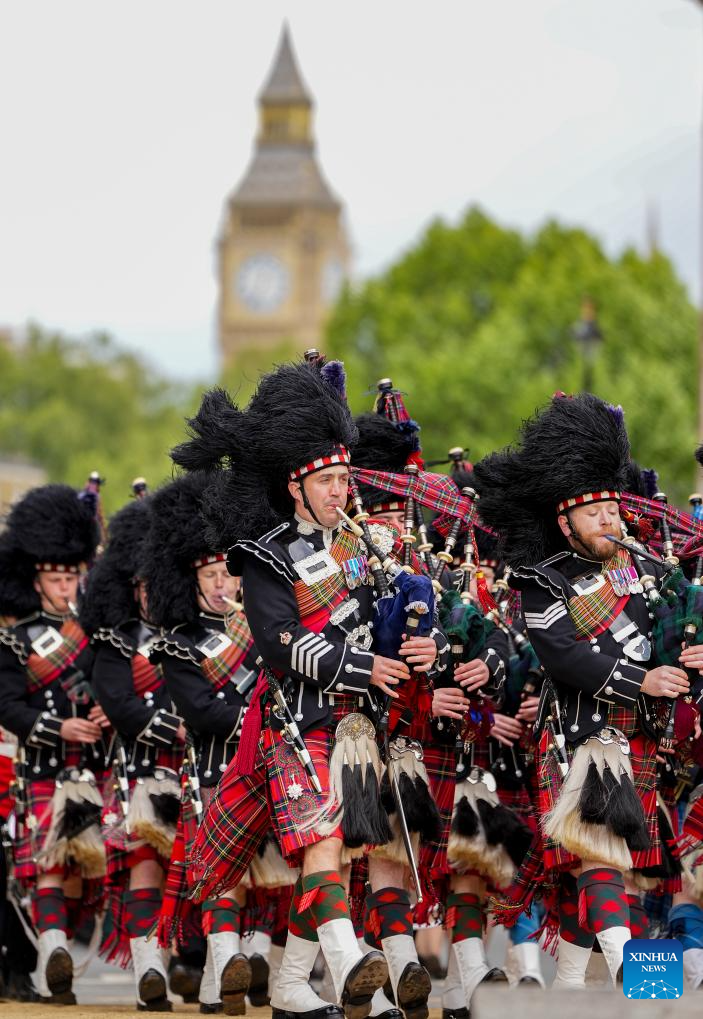 LONDRES, 6 mayo, 2025 (Xinhua) -- Imagen del 5 de mayo de 2025 de gaiteros participando en la procesión militar, en Londres, Reino Unido. Reino Unido realizó procesiones militares y un sobrevuelo de la Real Fuerza Aérea el lunes para conmemorar el 80 aniversario del Día de la Victoria en Europa. (Xinhua/Wu Lu)