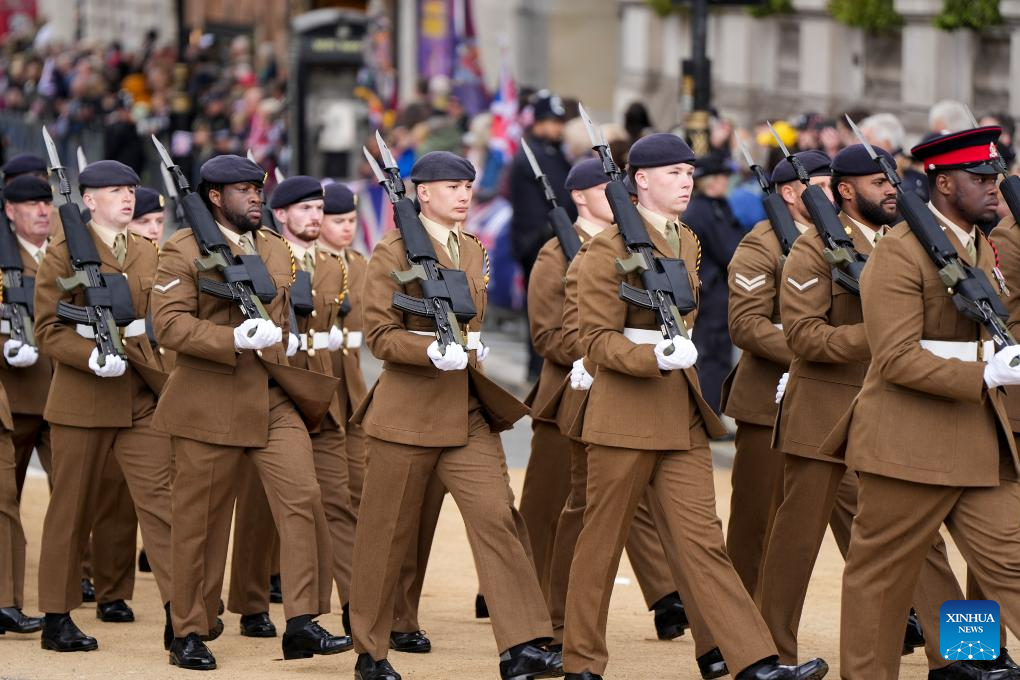 LONDRES, 6 mayo, 2025 (Xinhua) -- Imagen del 5 de mayo de 2025 de miembros de las fuerzas armadas participando en la procesión militar, en Londres, Reino Unido. Reino Unido realizó procesiones militares y un sobrevuelo de la Real Fuerza Aérea el lunes para conmemorar el 80 aniversario del Día de la Victoria en Europa. (Xinhua/Wu Lu)