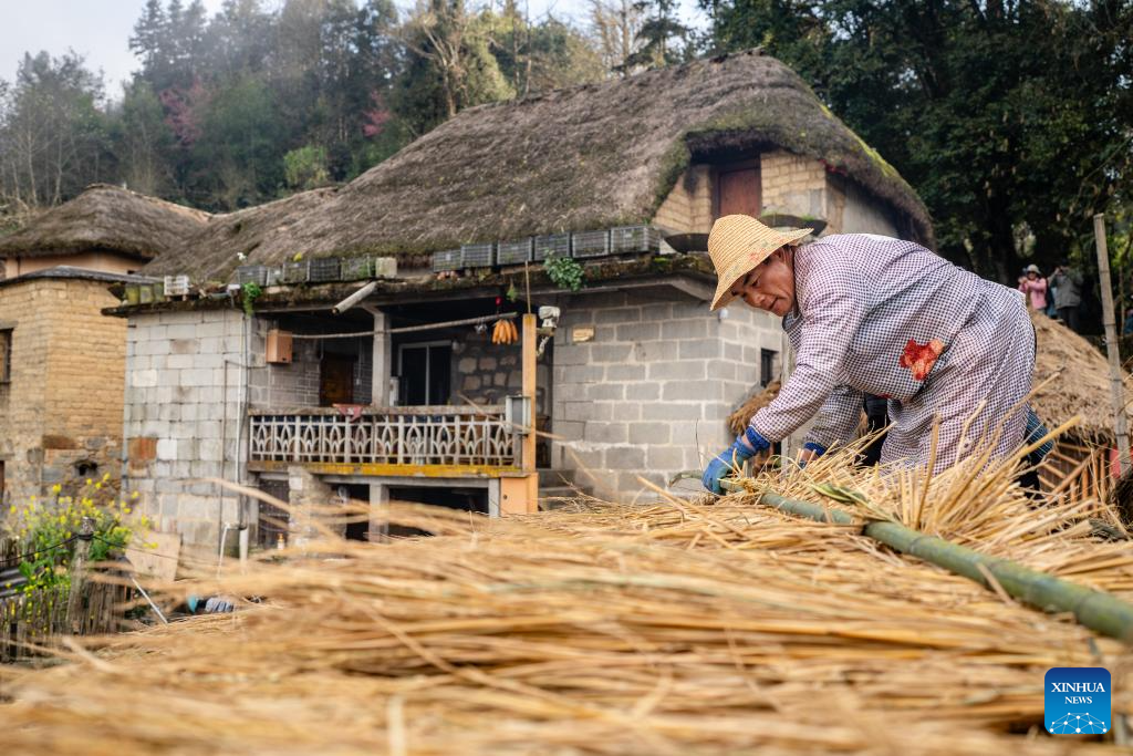 KUNMING, 6 mayo, 2025 (Xinhua) -- Imagen del 26 de febrero de 2025 de un aldeano manteniendo el tejado de paja de las casas tradicionales Hani, conocidas localmente como "casas hongo", en la aldea de Azheke del distrito de Yuanyang de la prefectura autónoma hani y yi de Honghe, en la provincia de Yunnan, en el suroeste de China. El Paisaje Cultural de las Terrazas de Arroz Hani de Honghe fue inscrito en la Lista del Patrimonio Mundial de la UNESCO en 2013. (Xinhua/Hu Chao)