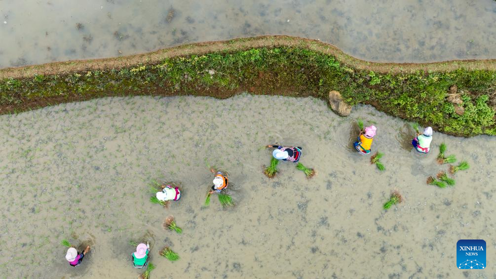 KUNMING, 6 mayo, 2025 (Xinhua) -- Vista aérea tomada con un dron el 2 de mayo de 2025 de aldeanos trasplantando plántulas de arroz en los campos aterrazados, en la aldea de Jiayin del distrito de Honghe de la prefectura autónoma hani y yi de Honghe, en la provincia de Yunnan, en el suroeste de China. El Paisaje Cultural de las Terrazas de Arroz Hani de Honghe fue inscrito en la Lista del Patrimonio Mundial de la UNESCO en 2013. (Xinhua/Hu Chao)