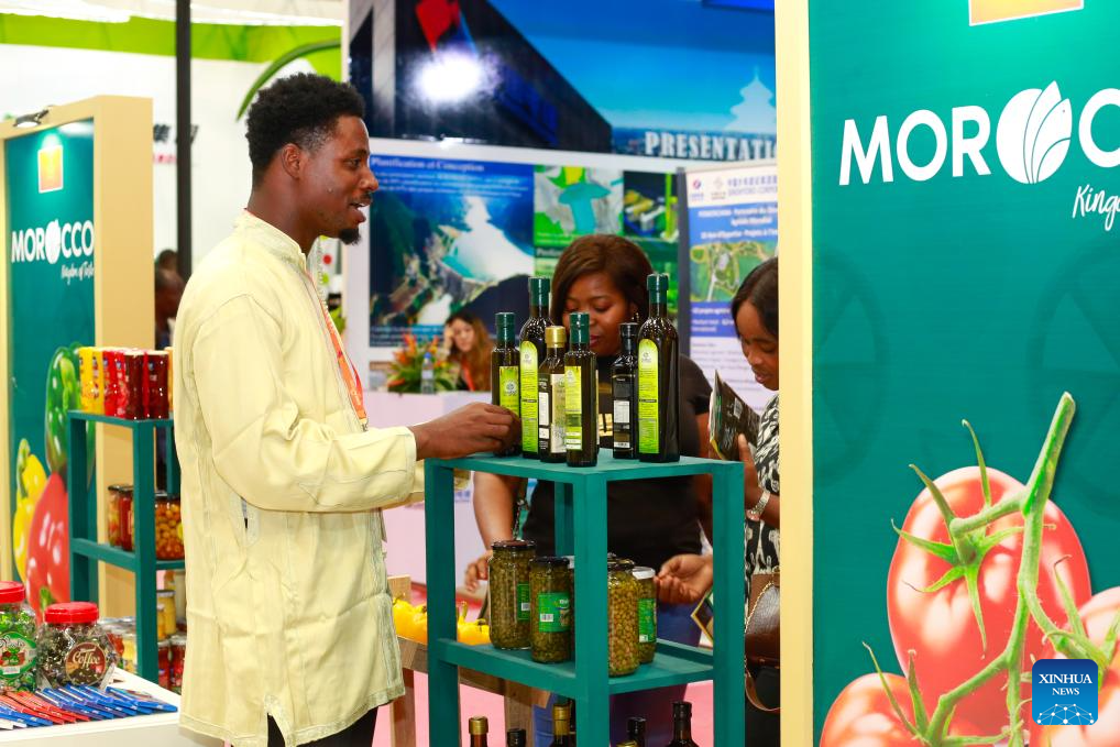ABIYÁN, 25 mayo, 2025 (Xinhua) -- Imagen del 23 de mayo de 2025 de una visitante aprendiendo sobre los productos en un estand marroquí durante la VII Exposición Internacional de Agricultura y Recursos Animales (SARA 2025) en el Centro de Exposiciones de Abiyán, en Abiyán, Cote d'Ivoire. La exposición, una importante feria agrícola en el oeste de Africa, abrió aquí el viernes, con China participando como invitado de honor. En un periodo de 10 días, se espera que la feria atraiga a más de 500.000 visitantes y cerca de 1.000 expositores presentando productos y servicios a lo largo de Africa, Asia y Europa. (Xinhua/Laurent Idibouo)