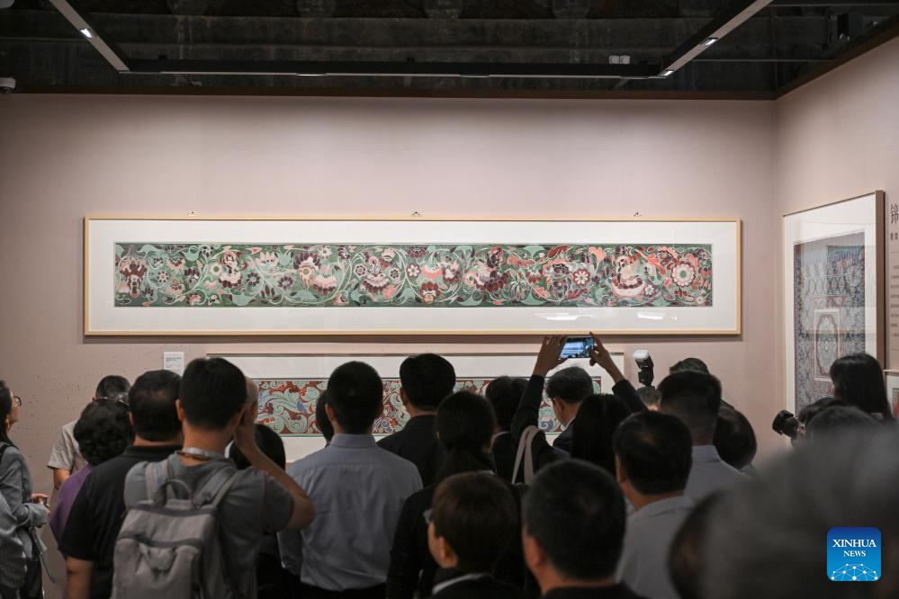 BEIJING, 27 mayo, 2025 (Xinhua) -- Imagen del 26 de mayo de 2025 de invitados observando una copia de una pintura Caihua de las Grutas de Mogao, en Dunhuang, en el noroeste de China, durante la exposición titulada "Un legado milenario de Caihua: Herencia e Innovación en la Pintura Policromada Arquitectónica China de Estilo Oficial", celebrada en el Museo del Palacio, en Beijing, capital de China. La exposición, abierta oficialmente al público el martes, exhibe 43 piezas de antiguos objetos Caihua chinos y obras de arte Caihua de estudiantes apoyados por el Fondo Nacional de las Artes de China. (Xinhua/Jin Liangkuai)