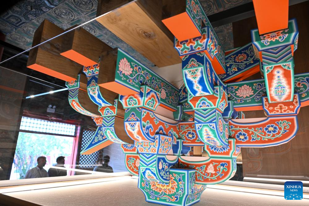 BEIJING, 27 mayo, 2025 (Xinhua) -- Imagen del 26 de mayo de 2025 de un antiguo elemento arquitectónico decorado con Caihua exhibido durante la exposición titulada "Un legado milenario de Caihua: Herencia e Innovación en la Pintura Policromada Arquitectónica China de Estilo Oficial", celebrada en el Museo del Palacio, en Beijing, capital de China. La exposición, abierta oficialmente al público el martes, exhibe 43 piezas de antiguos objetos Caihua chinos y obras de arte Caihua de estudiantes apoyados por el Fondo Nacional de las Artes de China. (Xinhua/Jin Liangkuai)
