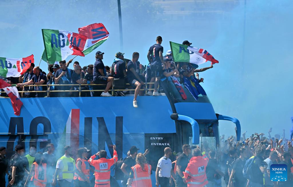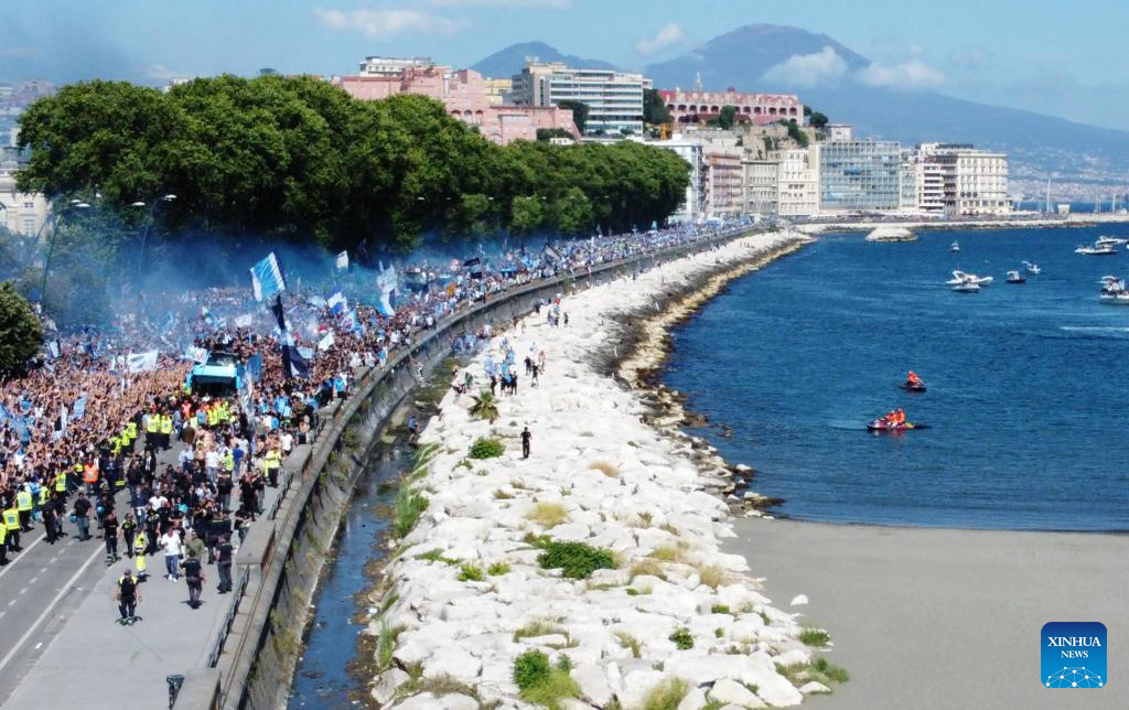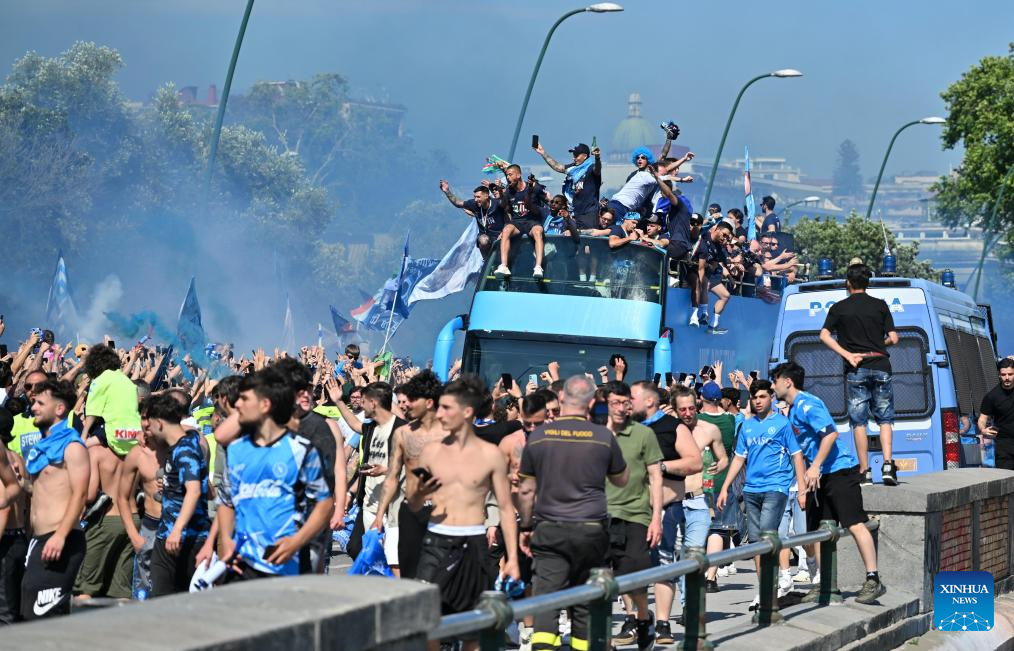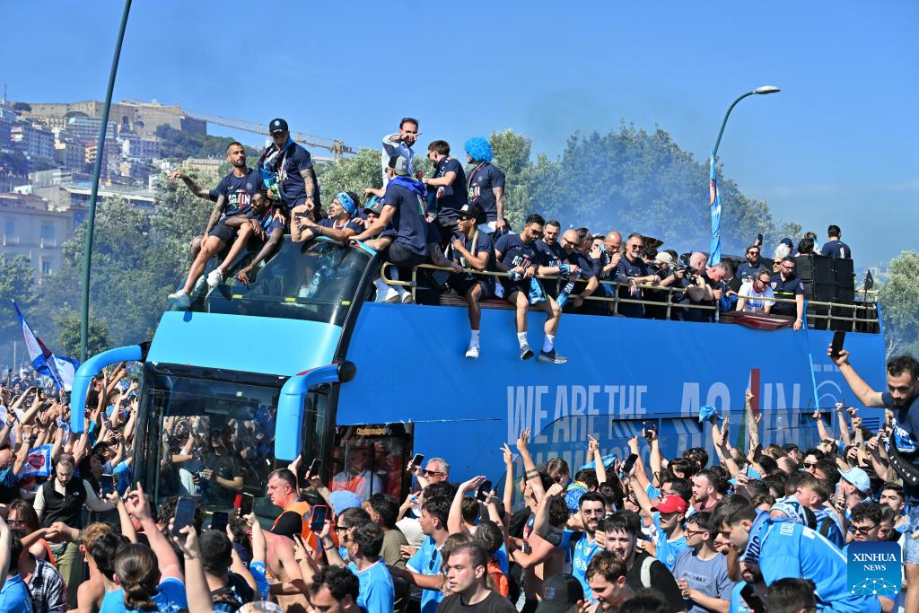 NAPOLES, 27 mayo, 2025 (Xinhua) -- Imagen del 26 de mayo de 2025 de jugadores de Napoli desfilando para celebrar el Campeonato de la Serie A, en Nápoles, Italia. (Xinhua/Alberto Lingria)