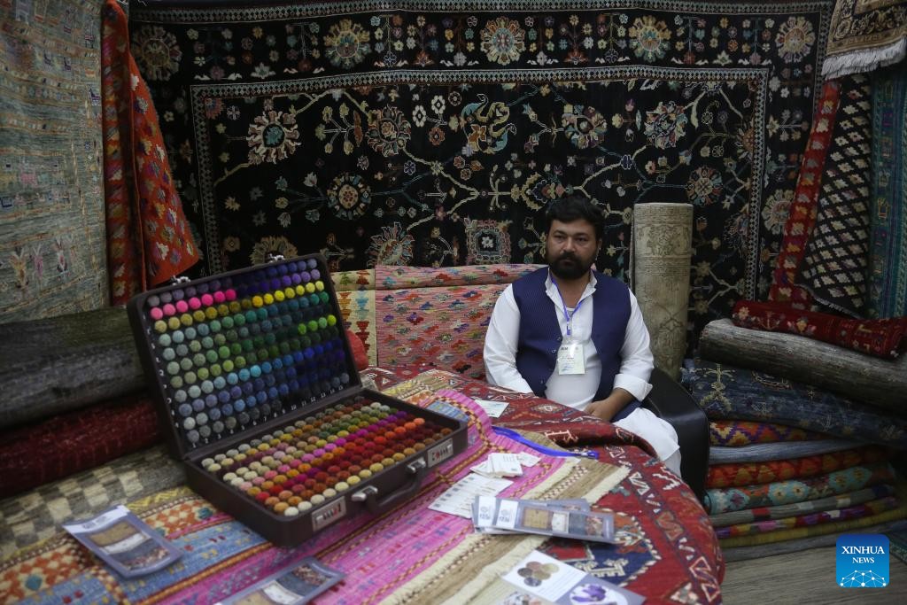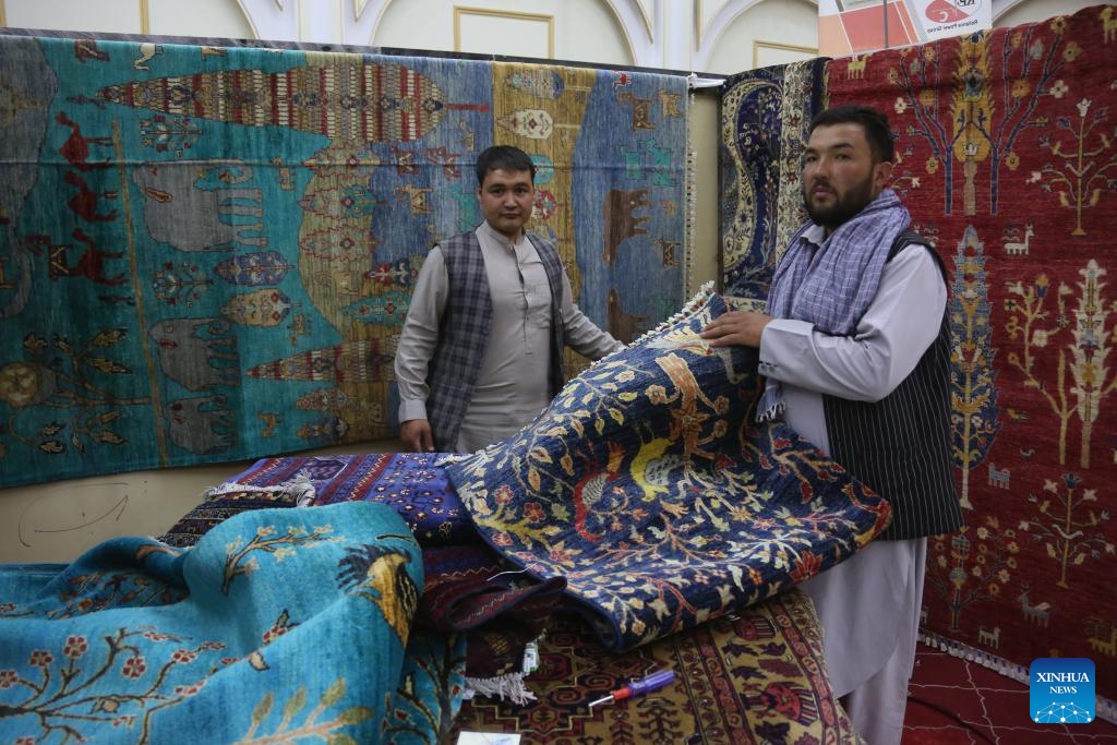 KABUL, 27 mayo, 2025 (Xinhua) -- Un expositor exhibe alfombras tejidas a mano en una exposición industrial, en Kabul, capital de Afganistán, el 27 de mayo de 2025. Una exposición industrial de seis días titulada "Semana de la Industria" se inauguró el martes en el Centro Internacional de Exposiciones de Afganistán, en Kabul, la capital de Afganistán. Según el comunicado del Ministerio de Industria y Comercio, la exposición pretende ayudar a los inversores nacionales, facilitar las interacciones entre particulares y empresas y educar al público sobre los productos locales. (Xinhua/Saifurahman Safi)