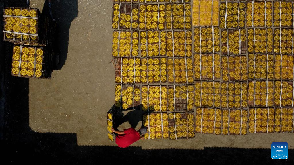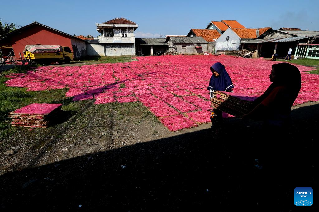 BOGOR, 28 mayo, 2025 (Xinhua) -- Vista aérea tomada con un dron de galletas rojas y amarillas tradicionales secándose en un taller casero, en la aldea de Karadenan, en la regencia de Bogor, Java Occidental, Indonesia, el 28 de mayo de 2025. (Xinhua/Yorri Farli)