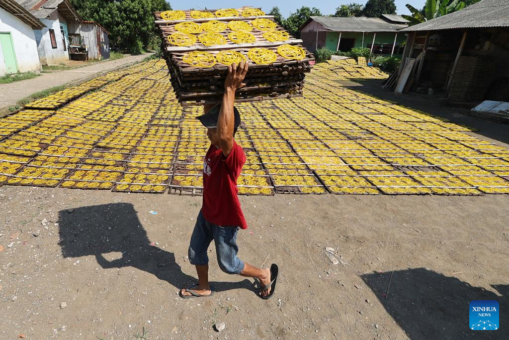 BOGOR, 28 mayo, 2025 (Xinhua) -- Un trabajador desliza galletas amarillas tradicionales de un plato de bambú después de secarlas en un taller casero, en la aldea de Karadenan, en la regencia de Bogor, Java Occidental, Indonesia, el 28 de mayo de 2025. (Xinhua/Yorri Farli)