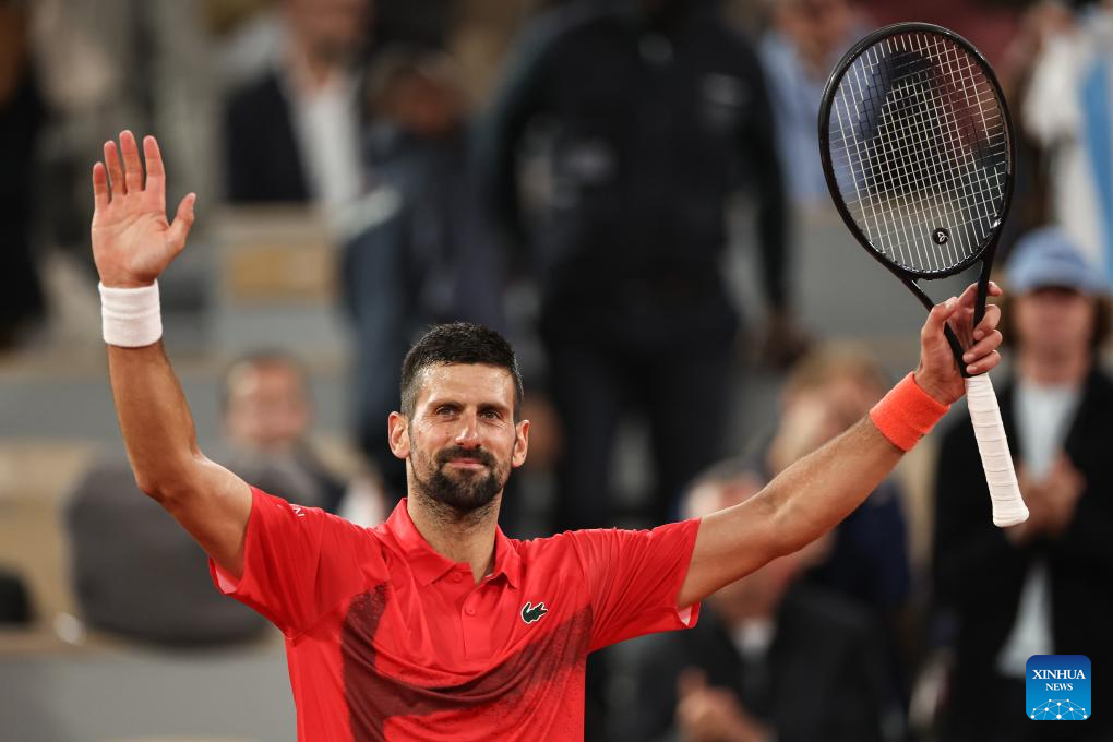PARIS, 28 mayo, 2025 (Xinhua) -- Imagen del 27 de mayo de 2025 de Novak Djokovic festejando después de ganar el partido de primera ronda de individuales masculinos entre Mackenzie Mcdonald, de Estados Unidos, y Novak Djokovic, de Serbia, en el torneo de tenis Abierto de Francia, en Roland Garros, en París, Francia. (Xinhua/Li Jing)