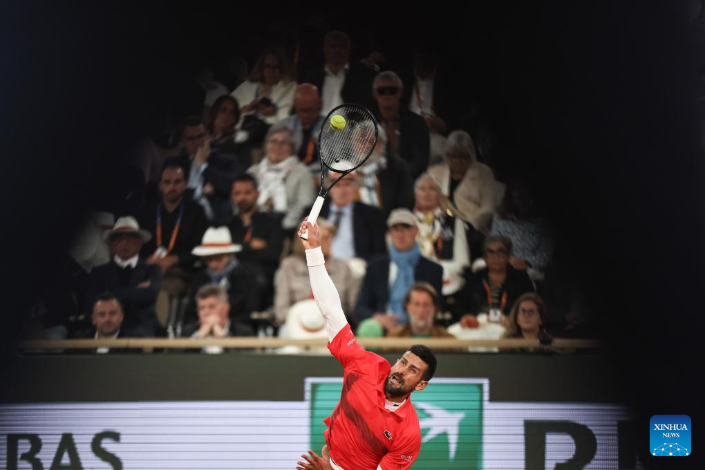 PARIS, 28 mayo, 2025 (Xinhua) -- Imagen del 27 de mayo de 2025 de Novak Djokovic sirviendo la pelota durante el partido de primera ronda de individuales masculinos entre Mackenzie Mcdonald, de Estados Unidos, y Novak Djokovic, de Serbia, en el torneo de tenis Abierto de Francia, en Roland Garros, en París, Francia. (Xinhua/Li Jing)