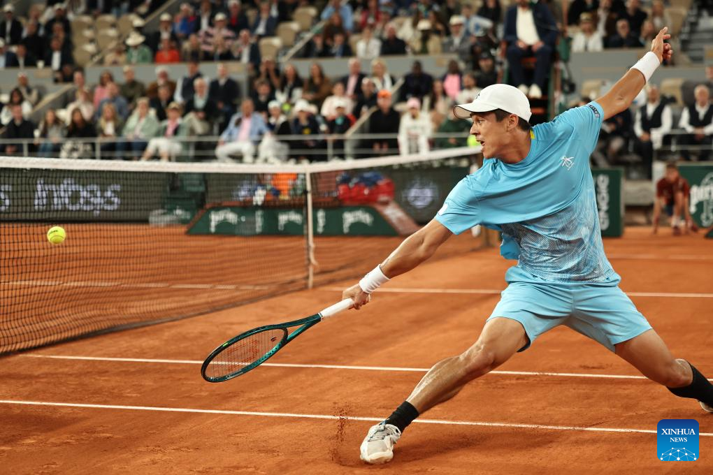 PARIS, 28 mayo, 2025 (Xinhua) -- Imagen del 27 de mayo de 2025 de Mackenzie Mcdonald devolviendo la pelota durante el partido de primera ronda de individuales masculinos entre Mackenzie Mcdonald, de Estados Unidos, y Novak Djokovic, de Serbia, en el torneo de tenis Abierto de Francia, en Roland Garros, en París, Francia. (Xinhua/Li Jing)