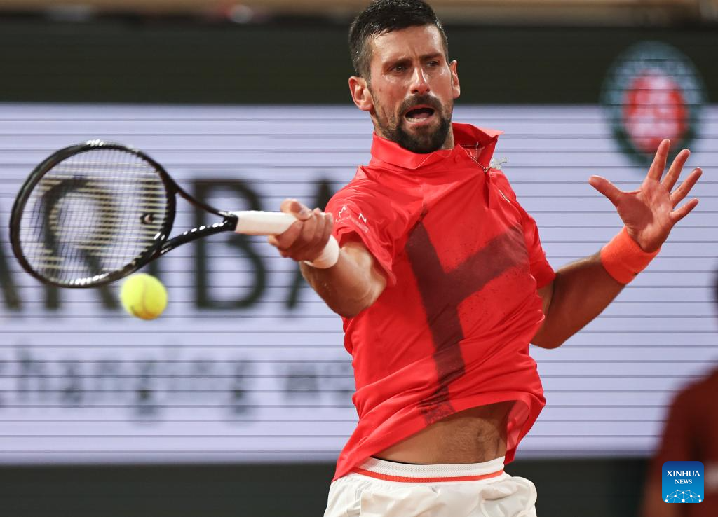 PARIS, 28 mayo, 2025 (Xinhua) -- Imagen del 27 de mayo de 2025 de Novak Djokovic devolviendo la pelota durante el partido de primera ronda de individuales masculinos entre Mackenzie Mcdonald, de Estados Unidos, y Novak Djokovic, de Serbia, en el torneo de tenis Abierto de Francia, en Roland Garros, en París, Francia. (Xinhua/Li Jing)