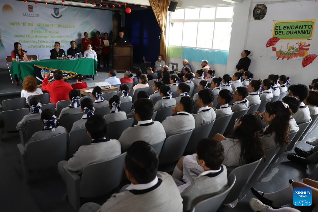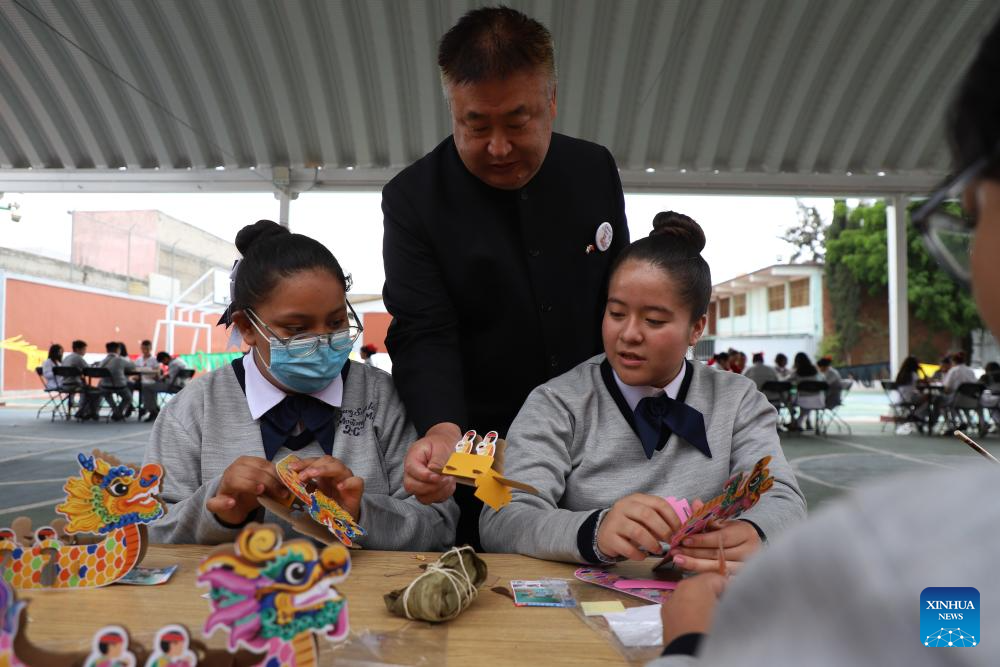 NEZAHUALCOYOTL, 29 mayo, 2025 -- Imagen del 28 de mayo de 2025 del director del Centro Cultural de China en México, Shi Yuewen (c), ayudando a estudiantes a armar botes del dragón durante un evento para celebrar el Festival del Bote del Dragón, en la Escuela Secundaria "Leyes de Reforma", en Nezahualcóyotl, México. (Xinhua/Daniel Augusto)