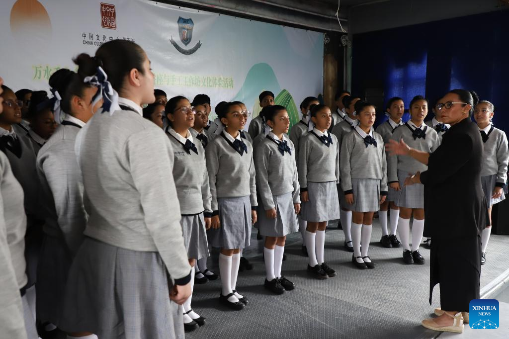 NEZAHUALCOYOTL, 29 mayo, 2025 -- Imagen del 28 de mayo de 2025 de un coro de estudiantes realizando una presentación durante un evento para celebrar el Festival del Bote del Dragón, en la Escuela Secundaria "Leyes de Reforma", en Nezahualcóyotl, México. (Xinhua/Daniel Augusto)