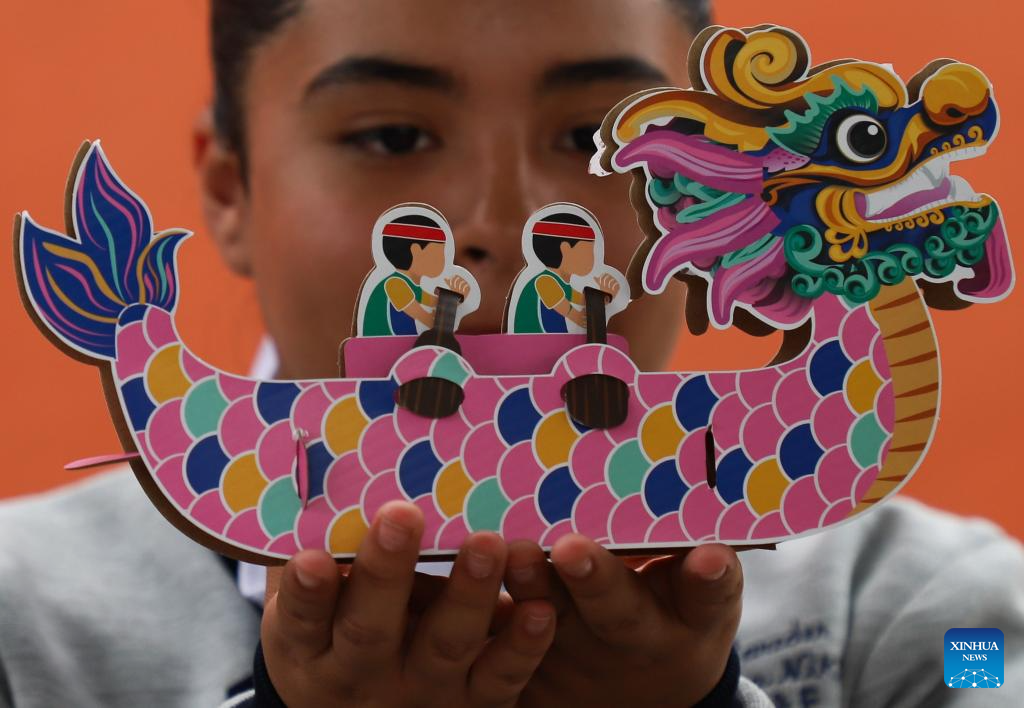 NEZAHUALCOYOTL, 29 mayo, 2025 -- Imagen del 28 de mayo de 2025 de una estudiante mostrando un bote del dragón durante un evento para celebrar el Festival del Bote del Dragón, en la Escuela Secundaria "Leyes de Reforma", en Nezahualcóyotl, México. (Xinhua/Daniel Augusto)