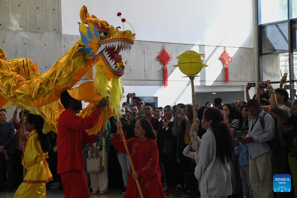 Imagen del 28 de mayo de 2025 de estudiantes del Instituto Confucio de la Universidad Bolivariana de Venezuela interpretando la danza del dragón durante el concurso Puente Chino, en la ciudad de Caracas, capital de Venezuela. Con entusiasmo y espíritu de intercambio cultural, estudiantes venezolanos participaron en la edición anual del concurso Puente Chino llevada a cabo el miércoles en el Gran Salón de la Universidad Venezolana de los Hidrocarburos, en la ciudad de Caracas. (Xinhua/Marcos Salgado)