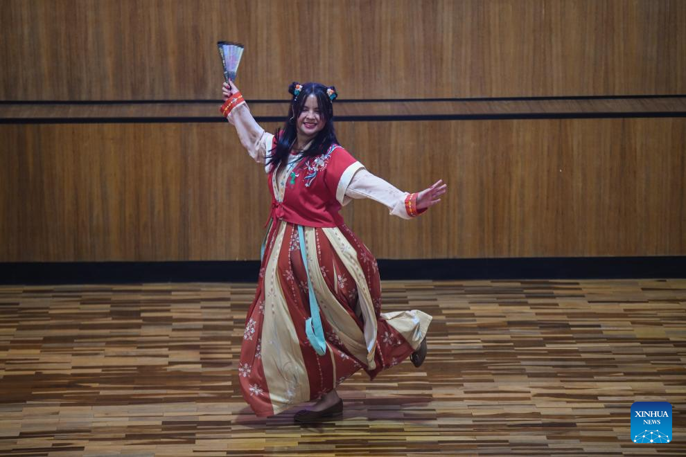 Imagen del 28 de mayo de 2025 de la concursante del Instituto Confucio de la Universidad Bolivariana de Venezuela, Elisa Contreras, participando durante el concurso Puente Chino, en la ciudad de Caracas, capital de Venezuela. Con entusiasmo y espíritu de intercambio cultural, estudiantes venezolanos participaron en la edición anual del concurso Puente Chino llevada a cabo el miércoles en el Gran Salón de la Universidad Venezolana de los Hidrocarburos, en la ciudad de Caracas. (Xinhua/Marcos Salgado)