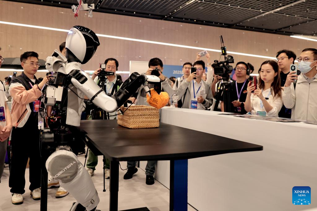SHANGHAI, 29 mayo, 2025 (Xinhua) -- Visitantes toman fotografías de un robot compitiendo en un concurso de organización de artículos diversos durante la Competencia Internacional de Habilidades de Robots Humanoides 2025 celebrada en el Salón de Ciencias de Zhangjiang, en Shanghai, en el este de China, el 29 de mayo de 2025. La Competencia Internacional de Habilidades de Robots Humanoides 2025 se inauguró el jueves en Shanghai, centrándose en escenarios industriales, domésticos y comerciales. Más de 60 equipos de todo el mundo compitieron en aplicaciones robóticas e innovación tecnológica clave. (Xinhua/Fang Zhe)