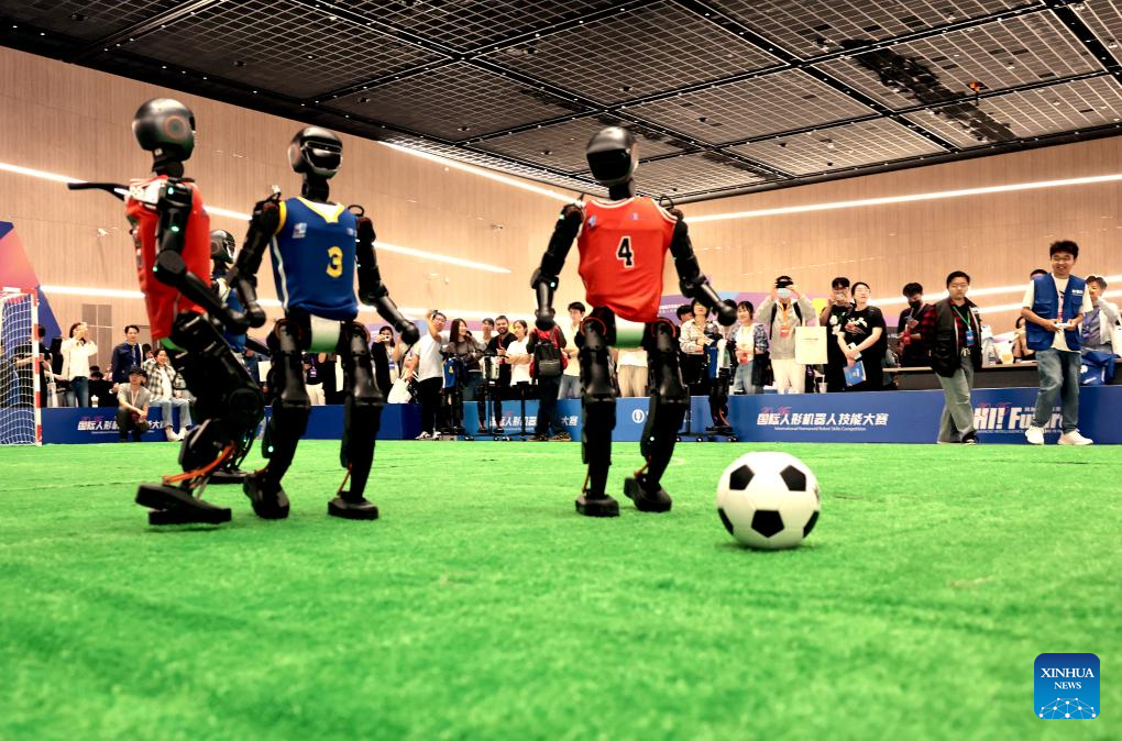 SHANGHAI, 29 mayo, 2025 (Xinhua) -- Robots "juegan" un partido de fútbol durante la Competencia Internacional de Habilidades de Robots Humanoides 2025 celebrada en el Salón de Ciencias de Zhangjiang, en Shanghai, en el este de China, el 29 de mayo de 2025. La Competencia Internacional de Habilidades de Robots Humanoides 2025 se inauguró el jueves en Shanghai, centrándose en escenarios industriales, domésticos y comerciales. Más de 60 equipos de todo el mundo compitieron en aplicaciones robóticas e innovación tecnológica clave. (Xinhua/Fang Zhe)