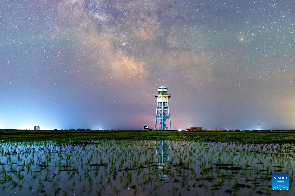 HARBIN, 30 mayo, 2025 (Xinhua) -- Imagen del 27 de mayo de 2025 de un campo de arroz bajo el cielo estrellado, en el poblado de Heli del distrito de Tangyuan, en la ciudad de Jiamusi, en la provincia de Heilongjiang, en el noreste de China. La Vía Láctea que se extiende por un cielo estrellado se refleja en los campos de arroz anegados, creando una escena impresionante en la noche de principios de verano. (Xinhua/Zhu Zongqiang)