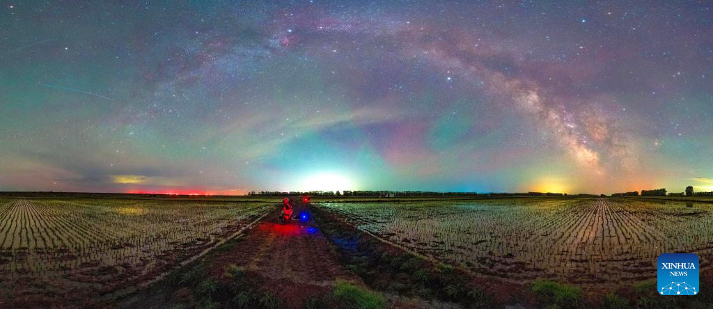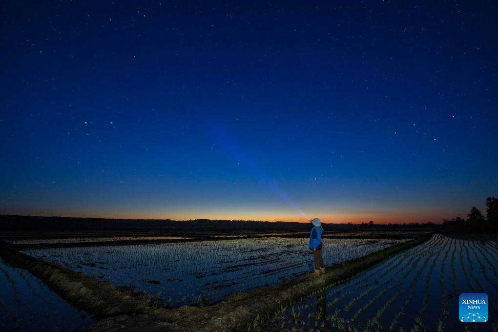 HARBIN, 30 mayo, 2025 (Xinhua) -- Imagen del 24 de mayo de 2025 de un entusiasta de la fotografía visto parado en un campo de arroz bajo el cielo estrellado en una granja, en la ciudad de Yichun, en la provincia de Heilongjiang, en el noreste de China. La Vía Láctea que se extiende por un cielo estrellado se refleja en los campos de arroz anegados, creando una escena impresionante en la noche de principios de verano. (Xinhua/Li Shaojun)