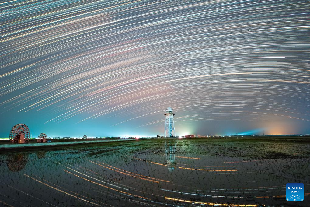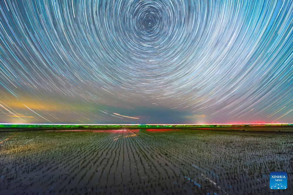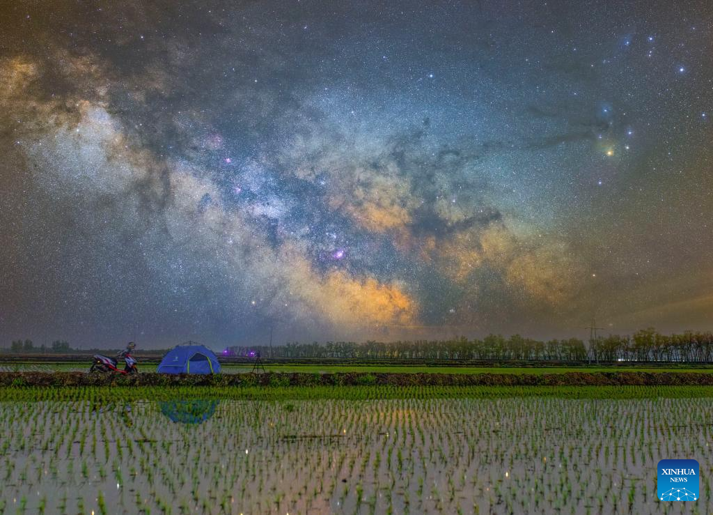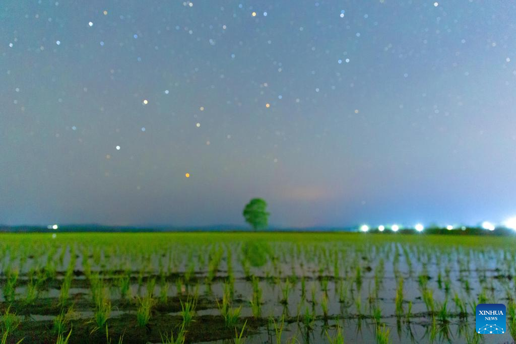 HARBIN, 30 mayo, 2025 (Xinhua) -- Imagen compuesta del 21 de mayo de 2025 del cielo estrellado sobre un campo de arroz, en el poblado de Chang'an de la ciudad de Jiamusi, en la provincia de Heilongjiang, en el noreste de China. La Vía Láctea que se extiende por un cielo estrellado se refleja en los campos de arroz anegados, creando una escena impresionante en la noche de principios de verano. (Xinhua/Qu Yubao)