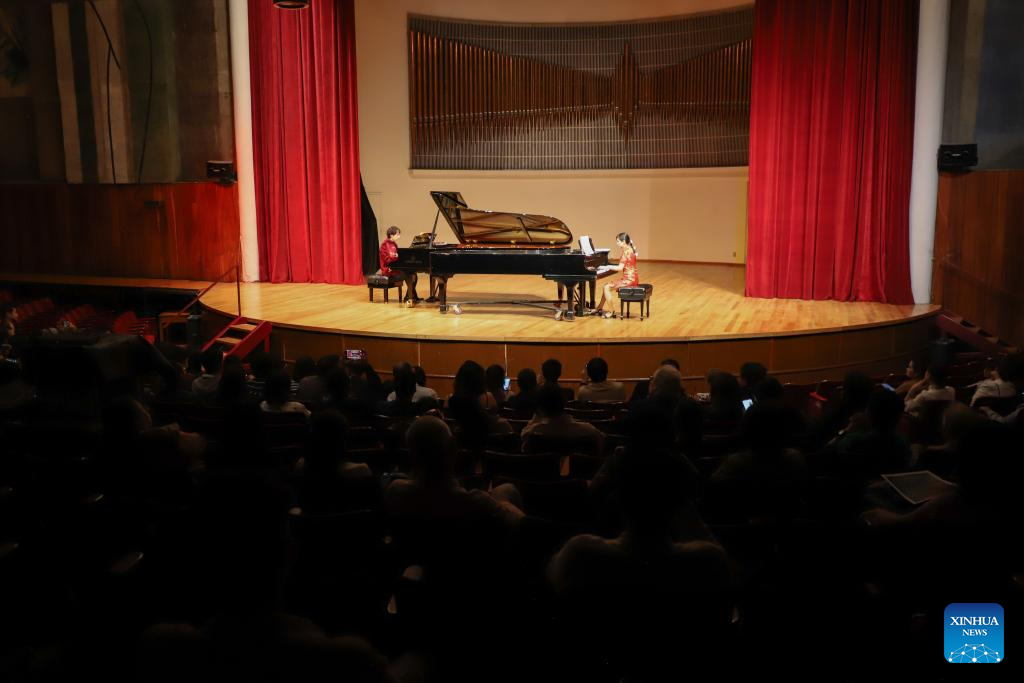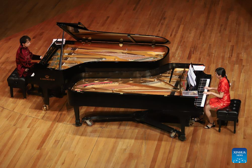 CIUDAD DE MEXICO, 31 mayo, 2025 (Xinhua) -- Imagen del 30 de mayo de 2025 de los pianistas Omar Gutiérrez (i) e Ivanna Gutiérrez (d) realizando una presentación durante el concierto a dos pianos "Melodías Eternas del Reino Chu" en el marco del Día Internacional del Diálogo sobre las Civilizaciones llevado a cabo en el Auditorio Silvestre Revueltas del Conservatorio Nacional de Música, en la Ciudad de México, capital de México. (Xinhua/Daniel Augusto)