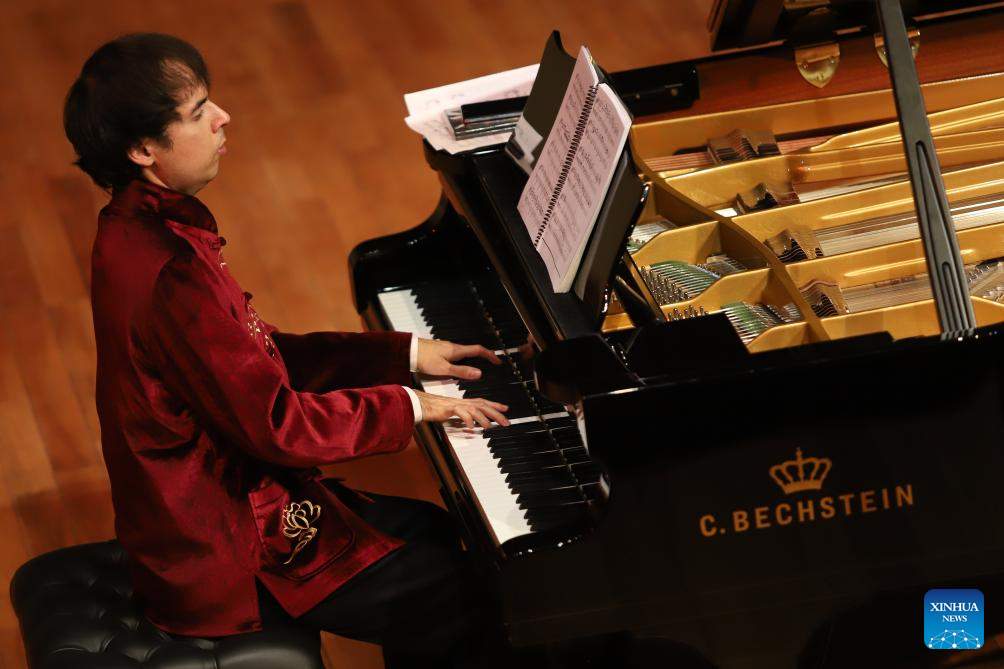 CIUDAD DE MEXICO, 31 mayo, 2025 (Xinhua) -- Imagen del 30 de mayo de 2025 del pianista Omar Gutiérrez realizando una presentación durante el concierto a dos pianos "Melodías Eternas del Reino Chu" en el marco del Día Internacional del Diálogo sobre las Civilizaciones llevado a cabo en el Auditorio Silvestre Revueltas del Conservatorio Nacional de Música, en la Ciudad de México, capital de México. (Xinhua/Daniel Augusto)