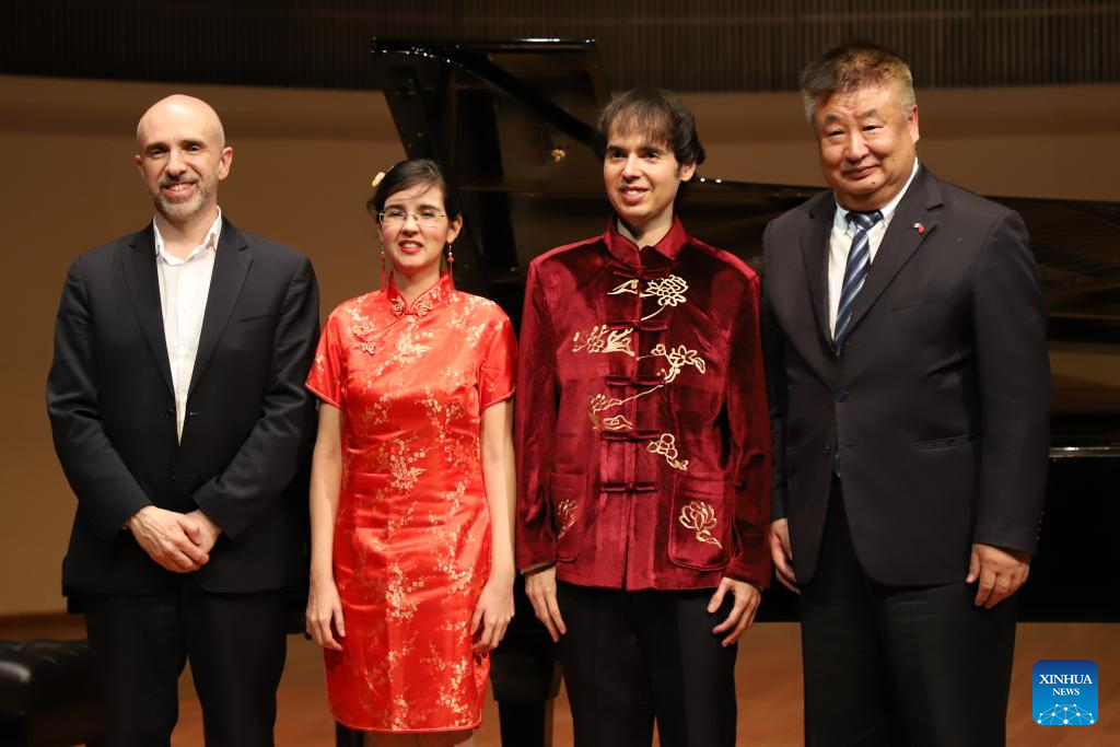 CIUDAD DE MEXICO, 31 mayo, 2025 (Xinhua) -- (De izq. a der.) Imagen del 30 de mayo de 2025 del director general de Promoción y Asuntos Internacionales de la Secretaría de Turismo de México, Emmanuel Romain Ernest Rey, los pianistas Ivanna Gutiérrez y Omar Gutiérrez, y el director del Centro Cultural de China en México, Shi Yuewen, posando para una fotografía grupal al término del concierto a dos pianos "Melodías Eternas del Reino Chu" en el marco del Día Internacional del Diálogo sobre las Civilizaciones llevado a cabo en el Auditorio Silvestre Revueltas del Conservatorio Nacional de Música, en la Ciudad de México, capital de México. (Xinhua/Daniel Augusto)