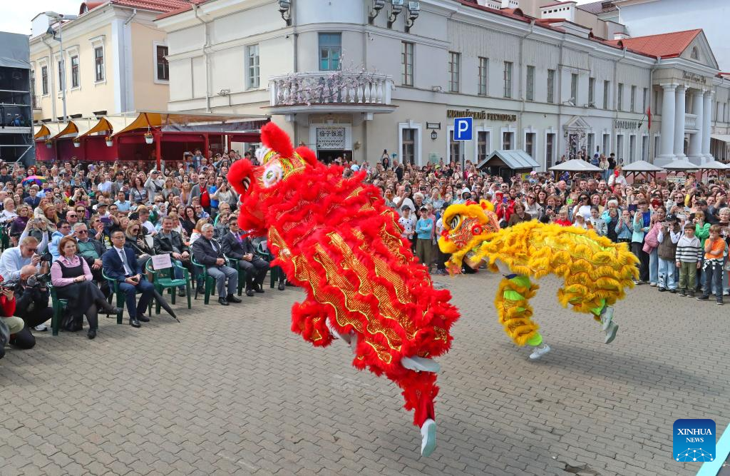 MINSK, 1 junio, 2025 (Xinhua) -- Imagen del 31 de mayo de 2025 de una danza del león escenificada durante el evento cultural "Té para la Armonía: Salón Cultural Yaji", celebrado en Minsk, Bielorrusia. (Xinhua/Henadz Zhinkov)