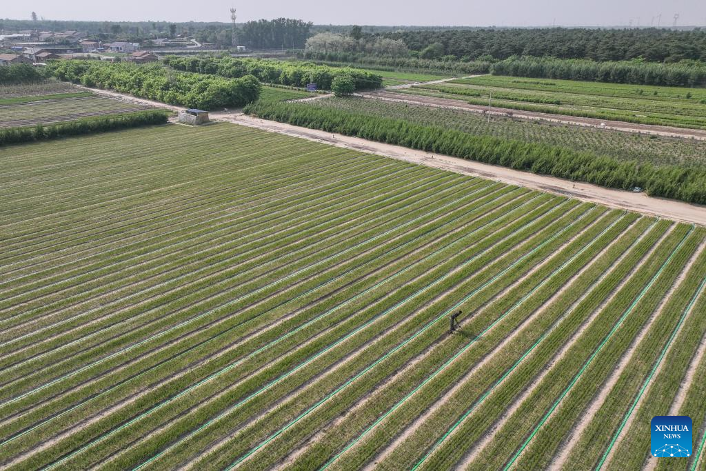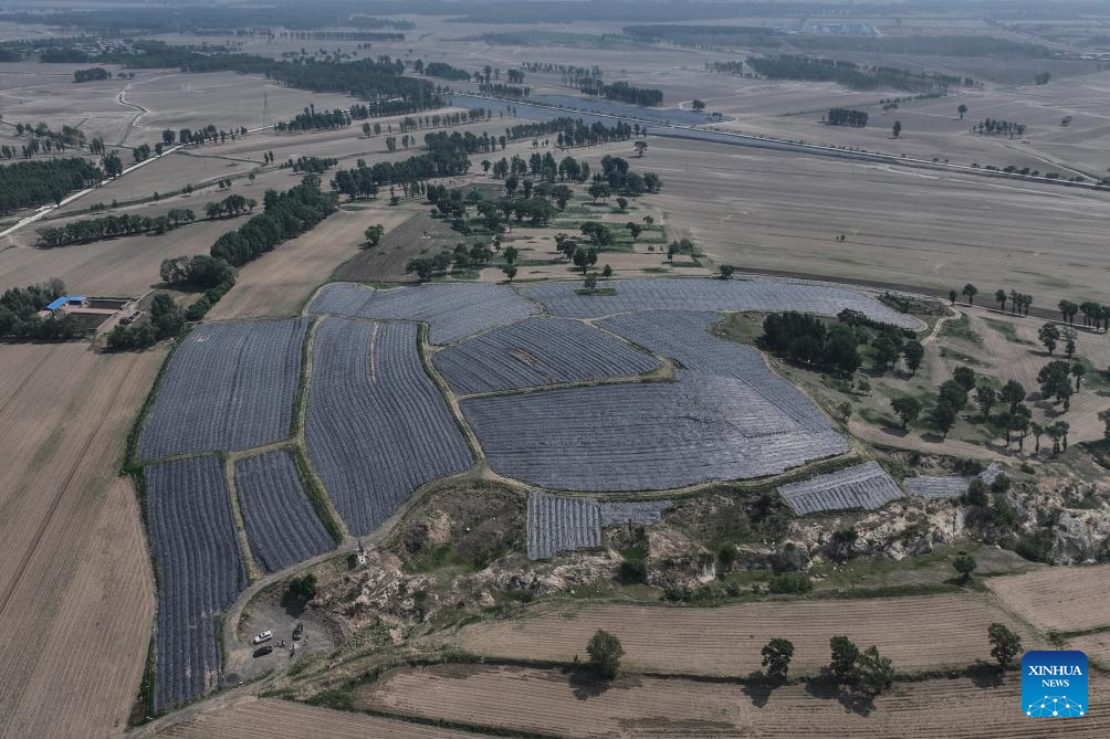 FUXIN, 1 junio, 2025 (Xinhua) -- Vista aérea tomada con un dron el 29 de mayo de 2025 de un proyecto de cultivo de gusanos de seda de sauce en un campo arenoso, en el municipio de Dade del distrito de Zhangwu, en Fuxin, en la provincia de Liaoning, en el noreste de China. Localizado en el extremo sur del arenal de Horqin, el distrito de Zhangwu solía estar plagado de tormentas de arena y polvo. Desde hace más de 70 años, sus habitantes no han cesado en su empeño de transformar el entorno ecológico de esta zona para ganar la dura batalla contra la desertificación. (Xinhua/Pan Yulong)