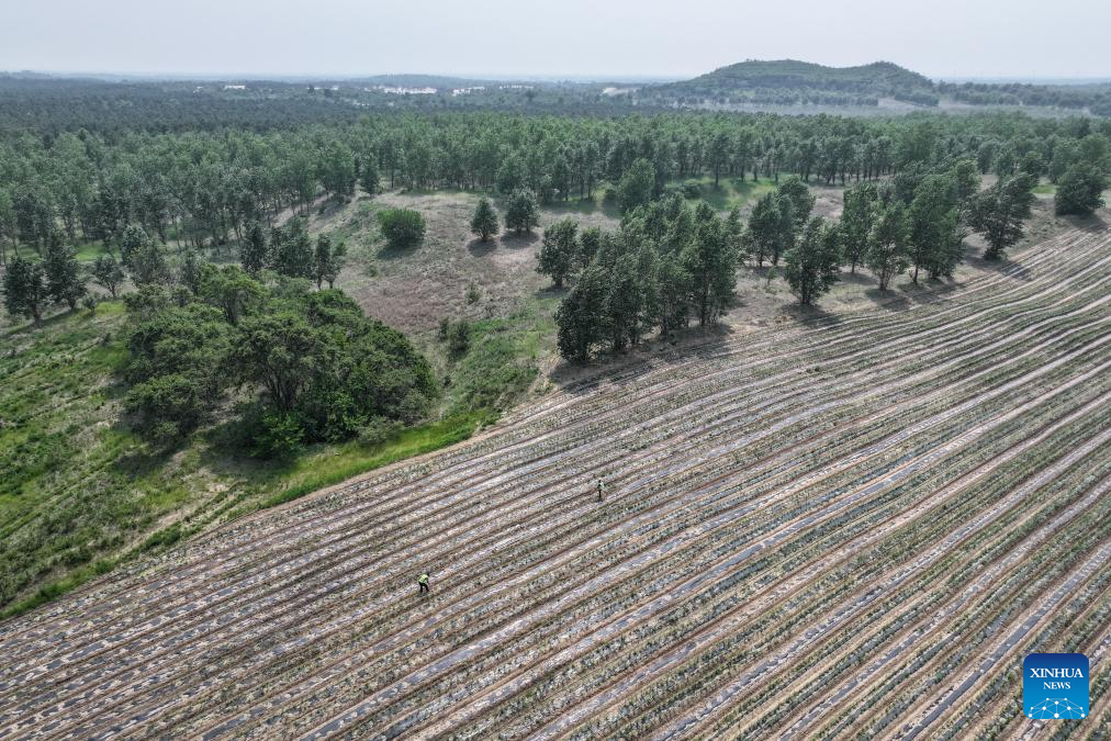FUXIN, 1 junio, 2025 (Xinhua) -- Vista aérea tomada con un dron el 30 de mayo de 2025 de un proyecto de plantación de azufaifo silvestre, en el municipio de Wufeng del distrito de Zhangwu, en Fuxin, en la provincia de Liaoning, en el noreste de China. Localizado en el extremo sur del arenal de Horqin, el distrito de Zhangwu solía estar plagado de tormentas de arena y polvo. Desde hace más de 70 años, sus habitantes no han cesado en su empeño de transformar el entorno ecológico de esta zona para ganar la dura batalla contra la desertificación. (Xinhua/Pan Yulong)