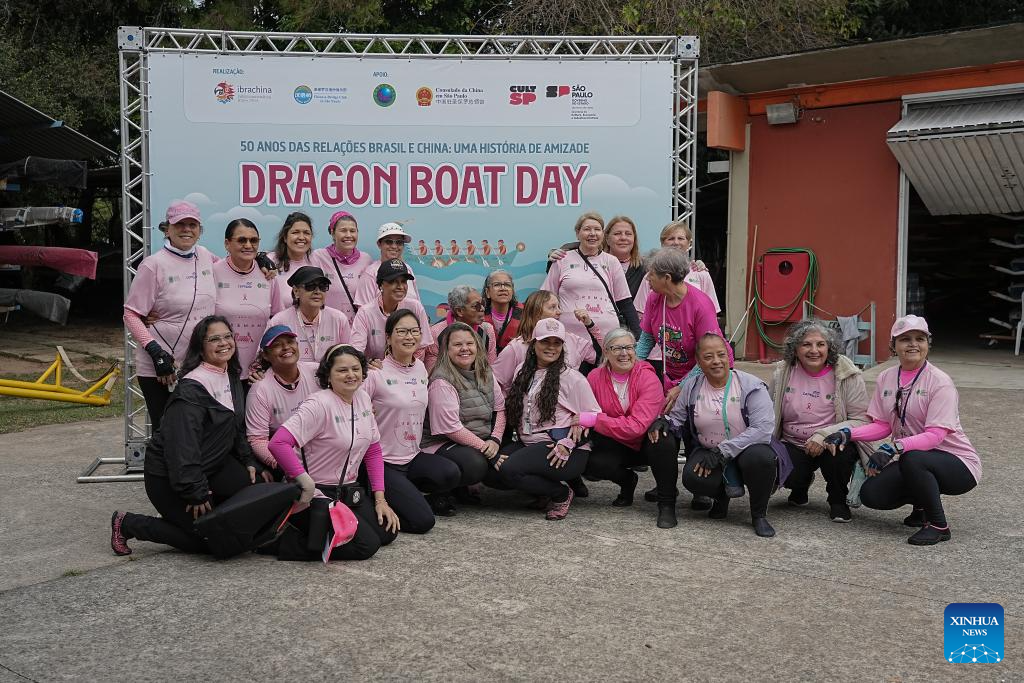 SAO PAULO, 1 junio, 2025 (Xinhua) -- Imagen del 31 de mayo de 2025 de mujeres posando para una fotografía grupal durante la tercera edición del Día del Bote del Dragón en la Pista Olímpica de la Universidad de Sao Paulo, en Sao Paulo, Brasil. (Xinhua/Paulo Lopes)