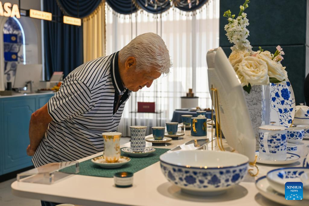 ESTAMBUL, 1 junio, 2025 (Xinhua) -- Imagen del 31 de mayo de 2025 de un cliente observando artículos de porcelana china en la tienda insignia oficial de porcelana de Jingdezhen, en Estambul, Turquía. Turquía y China inauguraron el sábado la primera tienda insignia oficial de porcelana de Jingdezhen en Estambul, lo que marca un avance en los lazos culturales y económicos a través de una alianza estratégica entre la ciudad china e Iznik, el histórico centro cerámico de Turquía. (Xinhua/Liu Lei)
