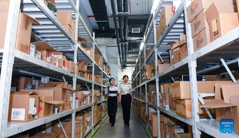 HAIKOU, 1 junio, 2025 (Xinhua) -- Imagen del 16 de mayo de 2025 de oficiales de aduanas realizando inspecciones de inventario mensuales en una bodega del Complejo Internacional de Compras Libres de Impuestos de Haikou, en Haikou, en la provincia de Hainan, en el sur de China. En junio de 2020, China lanzó un plan maestro para desarrollar Hainan en un puerto de libre comercio de alto nivel y globalmente influyente para la mitad de este siglo. En los años recientes, la provincia insular ha buscado convertirse en un centro internacional de turismo y consumo con un auge de compras libres de impuestos. (Xinhua/Yang Guanyu)