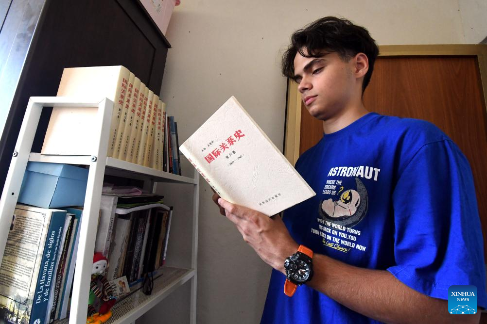 LA HABANA, 1 junio, 2025 (Xinhua) -- Imagen del 31 de mayo de 2025 del joven Marcel Curbelo, ganador de la edición cubana del concurso Puente Chino para estudiantes de la enseñanza media, leyendo un libro frente a un librero en su casa, en La Habana, capital de Cuba. Curbelo, reciente ganador de la edición cubana del Concurso Puente Chino para estudiantes de la enseñanza media, considera que la cultura china ha marcado su vida de manera profunda. (Xinhua/Joaquín Hernández)